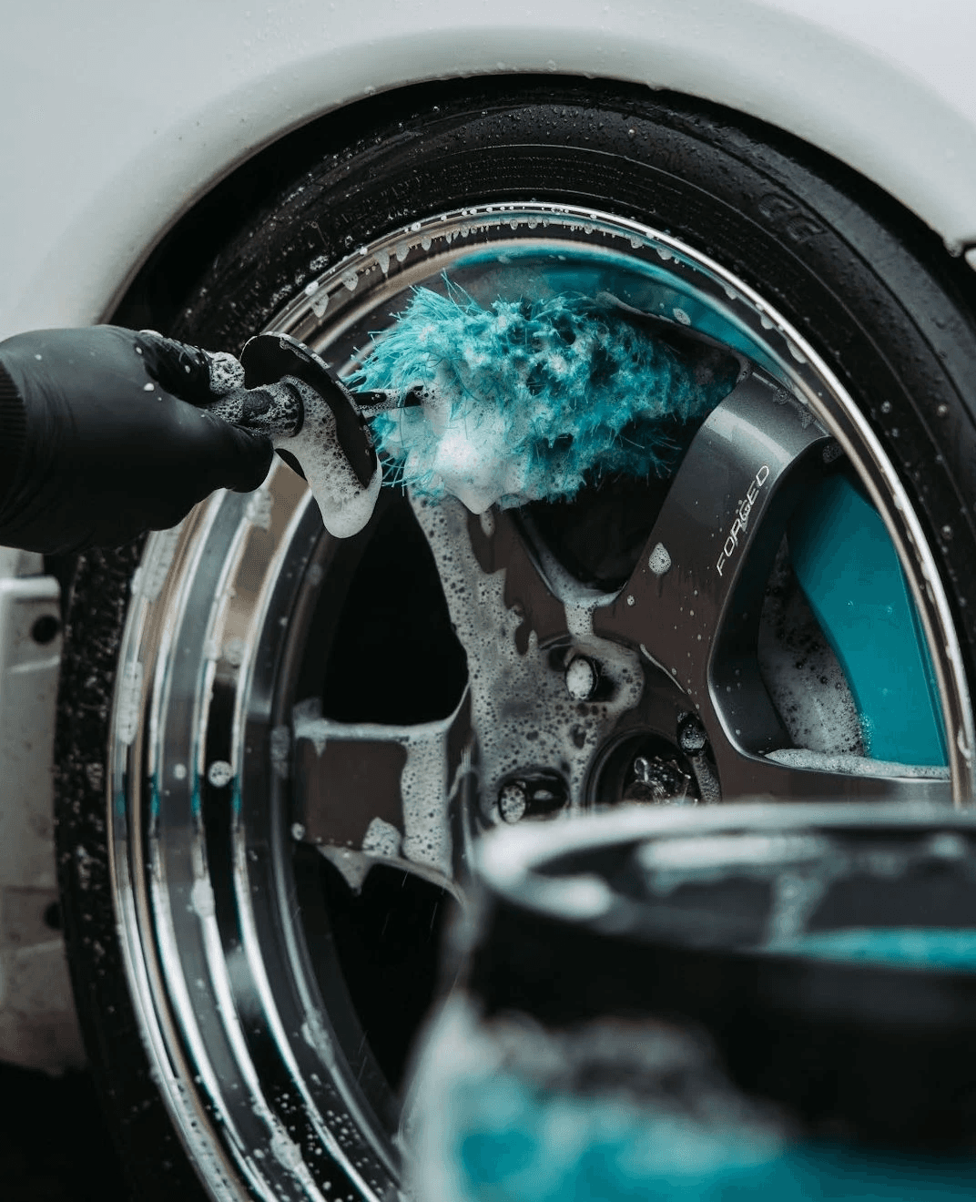 Traitement des jantes, prélavage mousse active, lavage contact et décontamination extérieure.